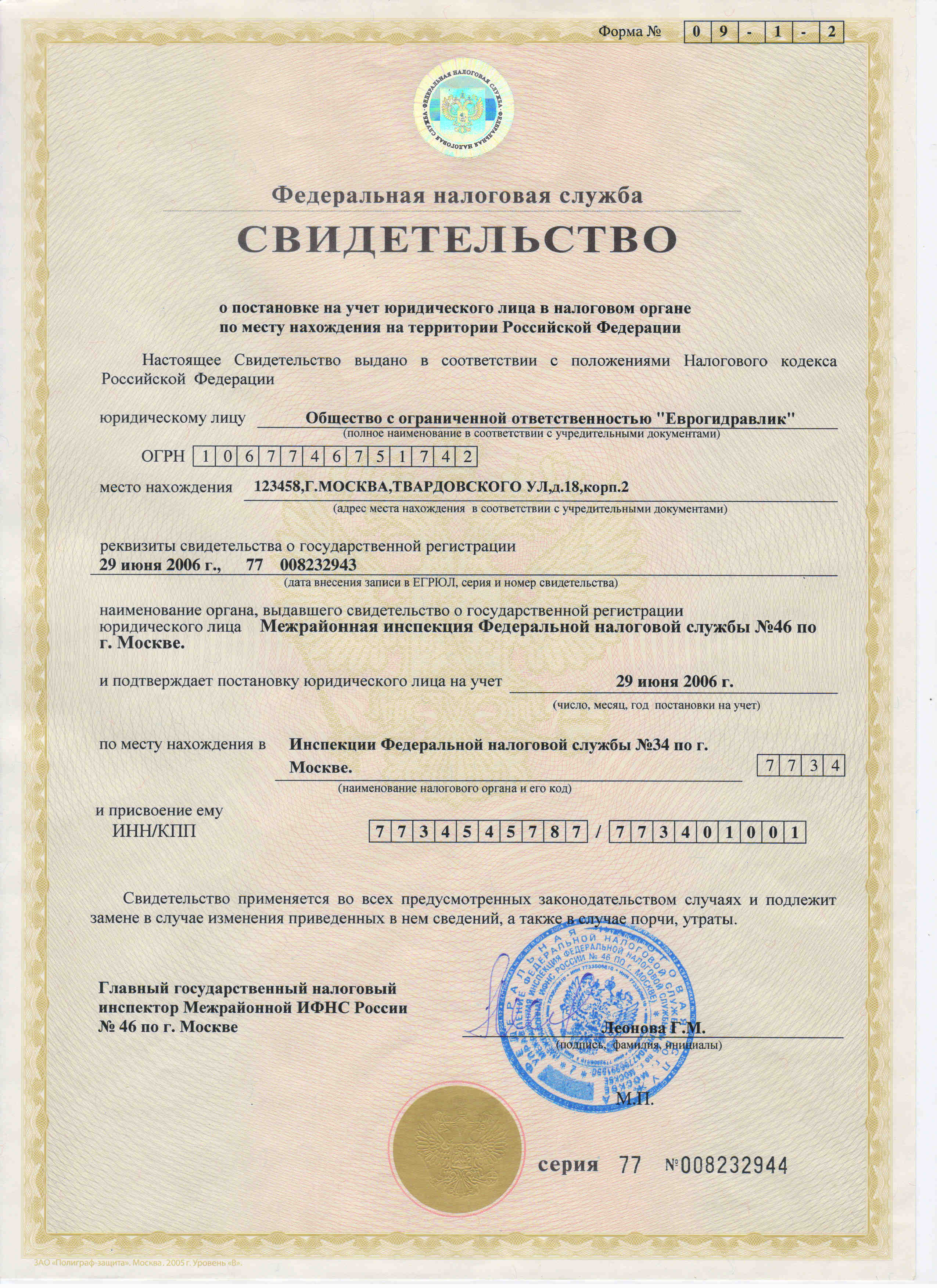 В данном разделе мы собрали основные юридические документы, подтверждающие официальную регистрацию компании ООО «Еврогидравлик».